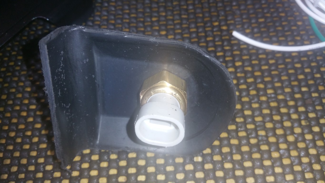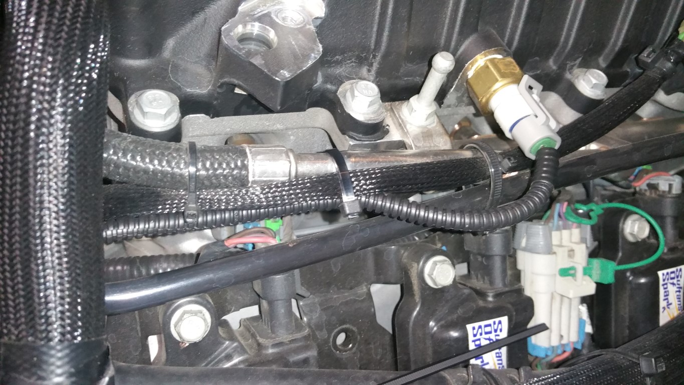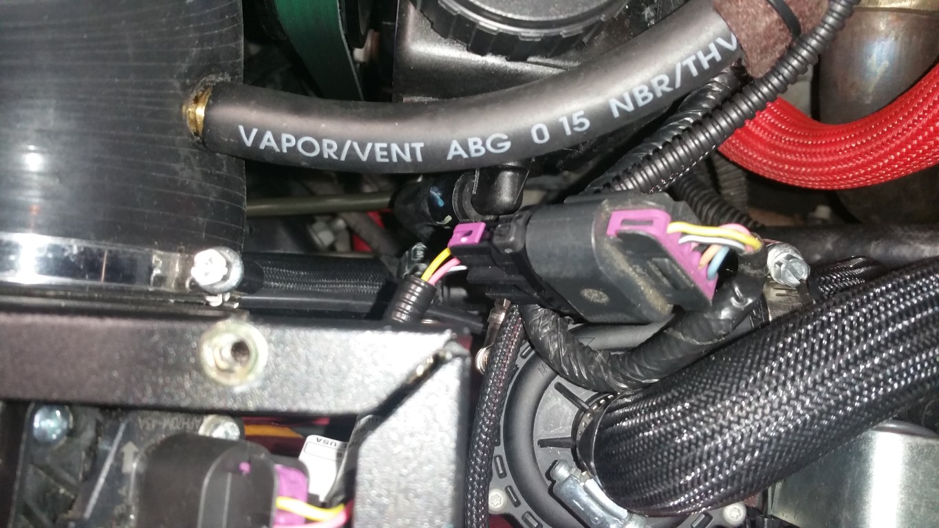 First, the location (right above the steering input): ![]() Routed over the master cylinder (once confirmed, I ty-rapped it down): ![]() Next, following the diagram, created a black, green, and white run and place it into the shielding -- then prepped it for soldering: Schematic: ![]() Wire setup and soldering: ![]() ![]() Connector ready to go! ![]() Next, I needed to mount the sensor inside the CAI. To do this I used a 90* plastic piece from one of the air dams I had (when I did the heat exchanger) and opened the hole just enough to screw in the sensor. I then used a 3/8 NPT nut on the other side to lock it down: ![]() ![]() ![]() ![]() Then, drilling a small hole in the CAI, I bolted it down using loctite and clear nail polish (to hold it there in place): ![]() little silicone (dries clear) to help hold it: ![]() ![]() Connected! ![]() Put the CAI lid back on and installed the inlet hose to the TB. Double checked everything to make sure its all tight. Tomorrow, hooking it up to the AeroForce. Still need to do the wiring inside, but the hard part is done! More to come... -Don