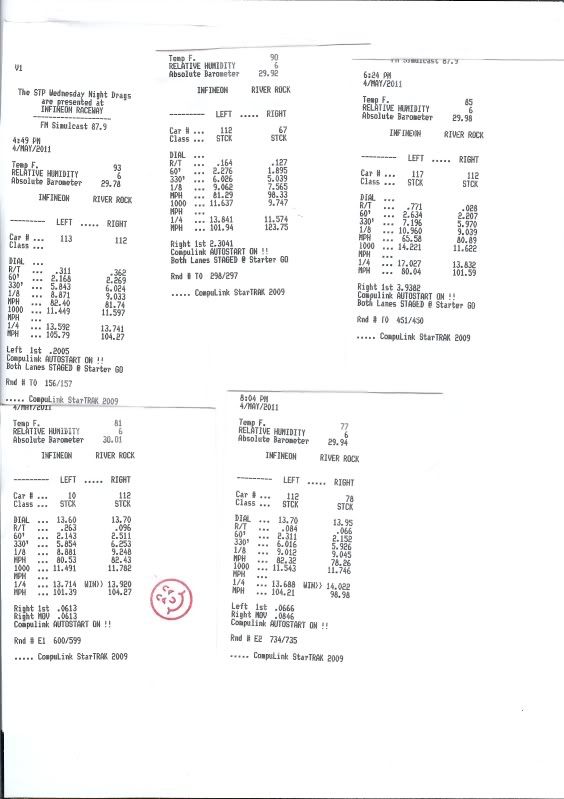 What exactly happened to Josh's car? Engine or other part of the drivetrain? I guess that will help him make up his mind about a crate or built motor that much faster. What was his best time before he blew? I see a high temp of 93 on one of those time slips, that's too hot to be running boost without a good fuel system and tune.
