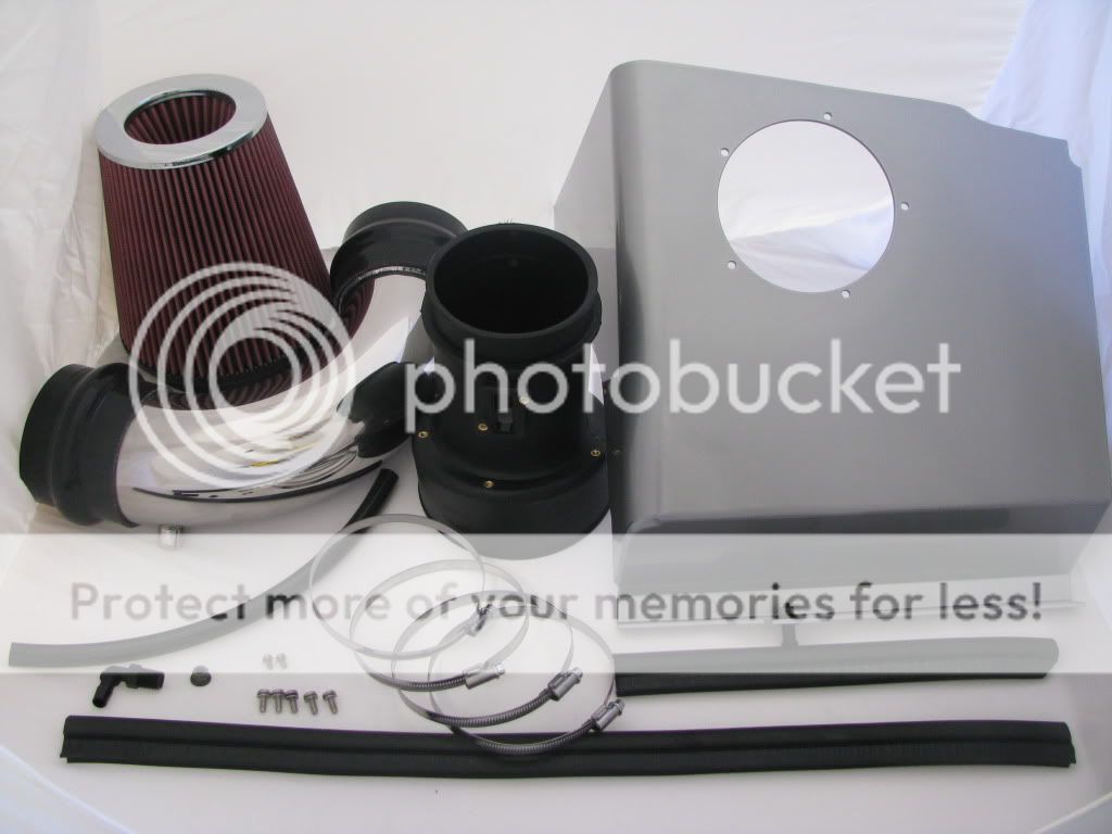 Here is the production intake system! Although we have many options, this is our "standard CAI." The retail price is $349.95. The inlet elbow and MAF housing are cross-link PE. Both hoses are high gloss black silicone hump hoses. The clamps are non-perforated stainless steel. The air box/wall is aluminum with a silver powder coat finish. The filter is an oil type filter with the end feeding cone and chrome end cap. (dry filters also available) Installation is very simple and all of the components fit very well.