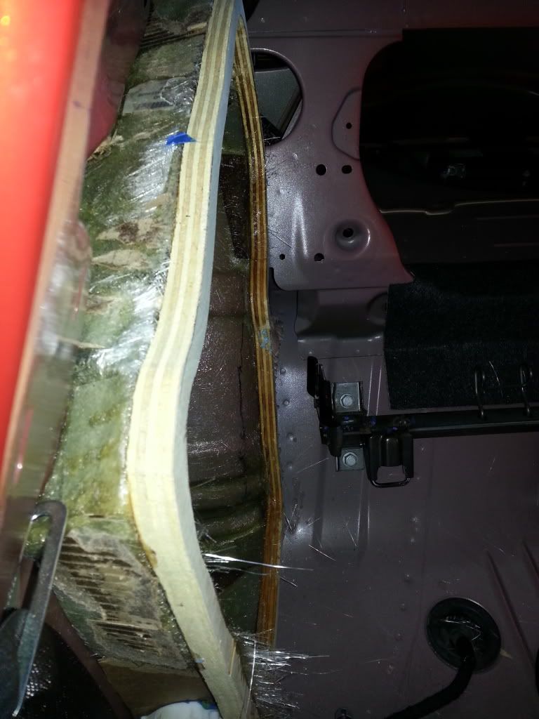 once i sprayed that down, waiting for it to cure I turned to the interior portion of the car. i rough cut a shape for each side, slid it behind the factory panel, and started using dowels to space it out the maximize airspace.