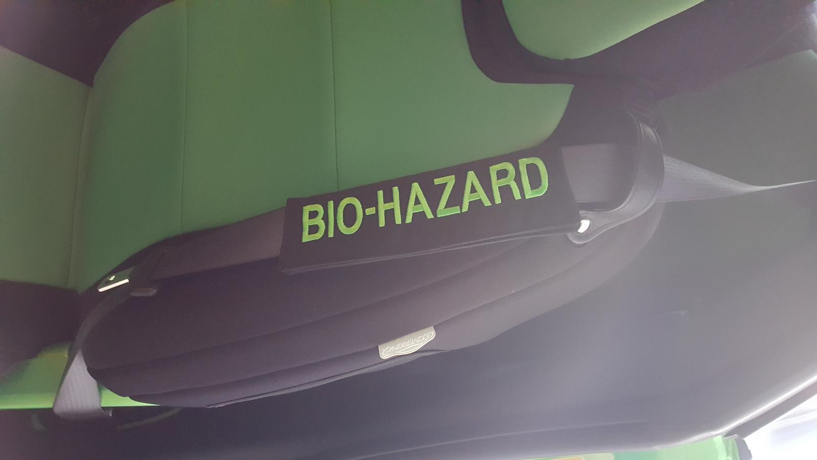And I placed my order for custom made seat belt shoulder pads , Black with BIO-HAZARD in neon green . alonf with a new key chain fob .