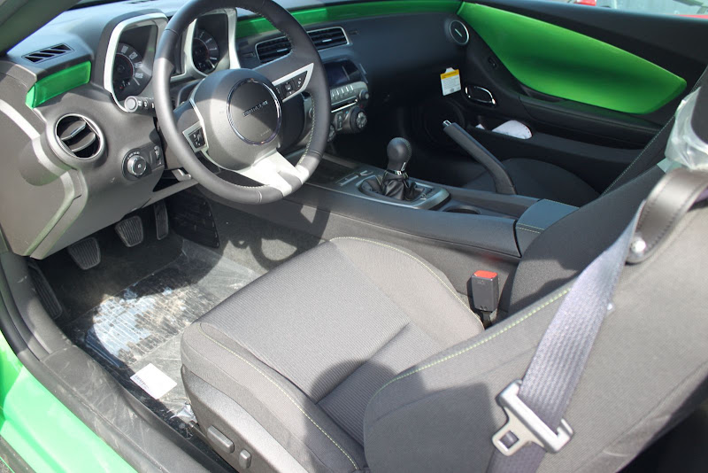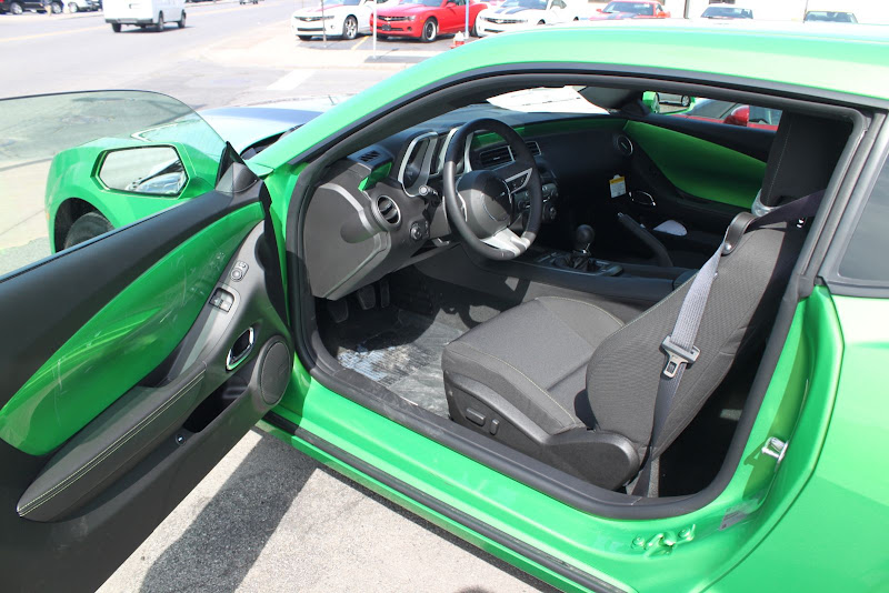 We just went to our dealer, and he FINALLY got the Synergy Green Camaro in. Ive been going all week, visiting banks, and searching for best interest rates...it rolled off the truck last night about 7 P.M. He called me, I was there at Noon Saturday. It wasnt prepped and checked yet, so it just sat on the lawn. When the sun hits it...OMG its A-M-A-Z-I-N-G!! I love it soo much, but Im afraid when we get it Monday, after a while I wont like it? Such a big decision. I like the interior a WHOLE lot as well. What do you guys that have synergys think? You think the color will ever wear off of you, and you wont like it? My first choice is Synergy, second is Rally yellow with black stripes, and then IBM. I drove a demo one for a weekend, it was white with black stripes, and it was soo sleek, and even being white, EVERYONE wouldnt stop staring! I personally love the attention they get, so thats another reason I want the green. And I like that you can get cloth seats with green trim, and still get the fiberglass<--?? with the ambient lighting. Now that im talking about it, Ive decided I just fell more in love with it. Considering the past week ALL that I have talked about is the car, and my parents and friends are getting annoyed. Haha. Well, heres pics. We are getting it Monday or Tuesday. Has to be quick because people are already stopping to look into buying it. But...I will get it, not them! Haha.