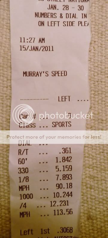 Still completely stock on stock tires The temp was around 52*, humidity was 45%, barometric pressure 30.26 and the DA was around -600. I think the car has a little more in it to make very high 12.50's, I'm just not sure the driver does.