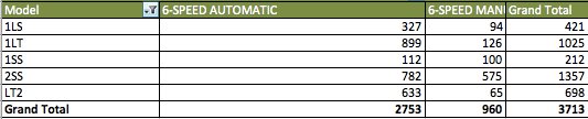 Here was the breakdown of the VIN's I accumulated through March 6th, 2011. There were several weeks of production for SGM after that.