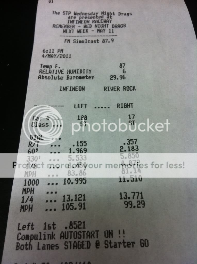 My first (and only) run was a 13.060 and i dont have the timeslip so i dont have the R/T or 60' time.