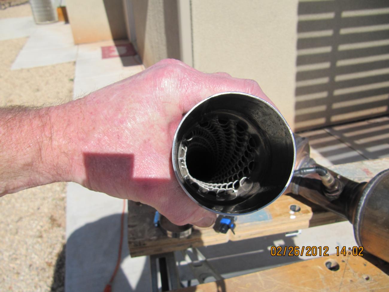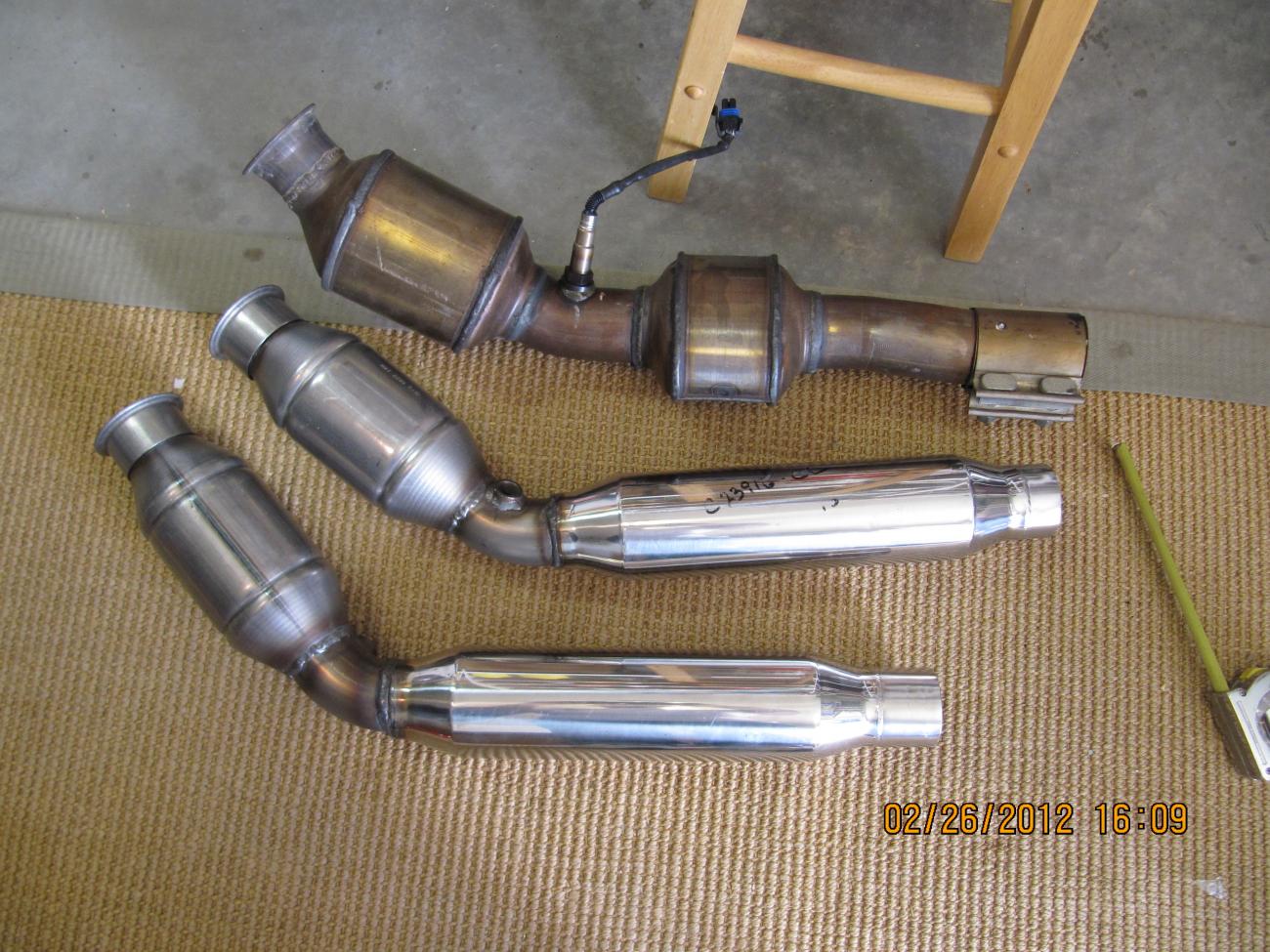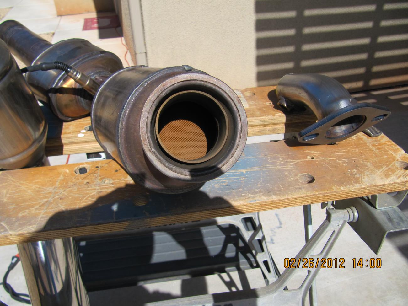 I'm gonna have to trim a little off the stock catback to squeeze them in. I've included a shot showing what you get for your $. First pick the interior of the stock cat, then Solo cat and resonator: |