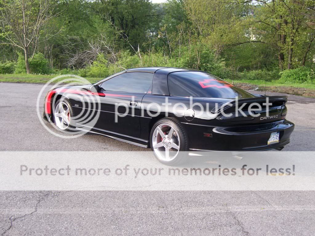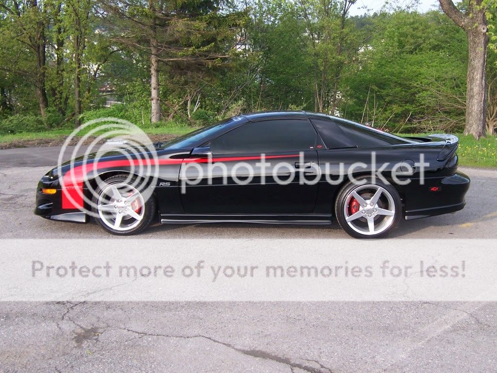 Here's my 98. It is a 3.8 V6 auto with the factory ground effects kit. I added a Xenon front spoiler, and my brother and I repainted in in porsche black with a Viper red 69 style hockey stripe. Further mods included tinted windows, a Flowmaster catback, billet grill, headlight&taillight covers, chrome RS and Camaro badges, custom bowtie vinyl overlays for the running lights and 3rd brake light, painted calipers, and just recently a set of polished Corvette C6 wheels. It may not be a V8, but it gets lots of looks and has been a great car for the 7 years that I have owned it. 95K and going strong!