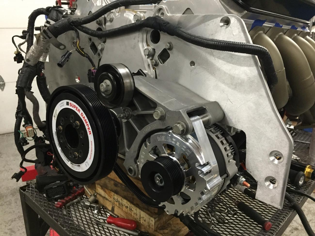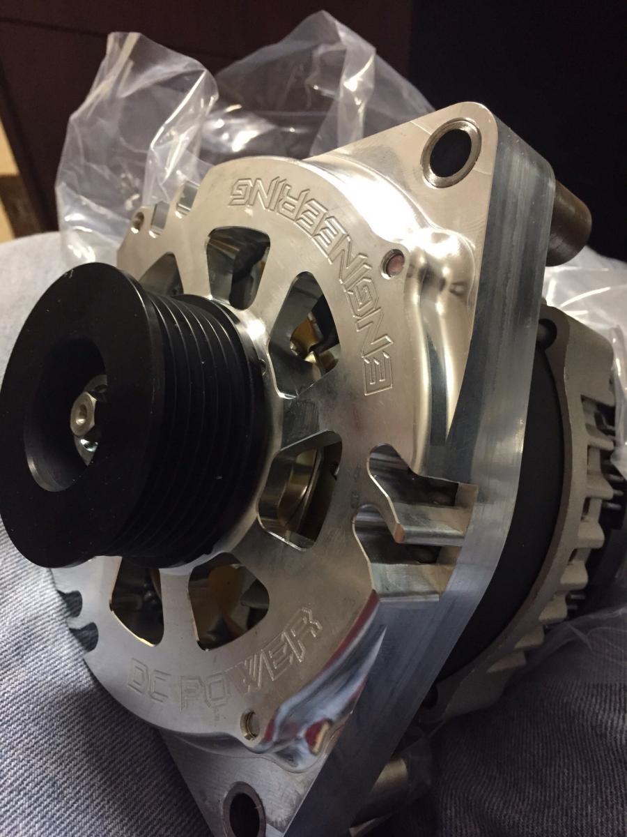 So with driving the two Lingenfelter fuel pumps in the tank, and the two big Weldon external fuel pumps, fans etc..., we decided some power was needed for the charging system... This is a DC Power Engineering 250 amp alternator... No lack of juice here... I had to do some light clearancing to fit it but that was no issue...