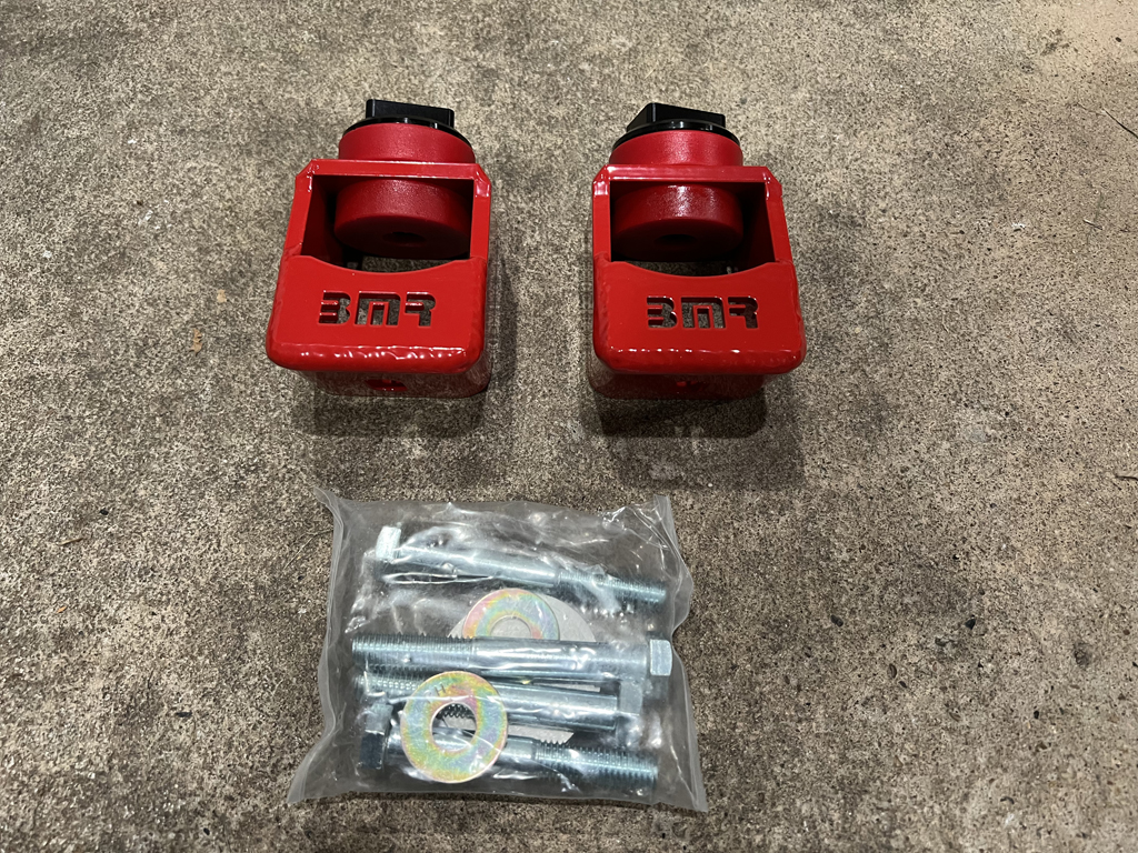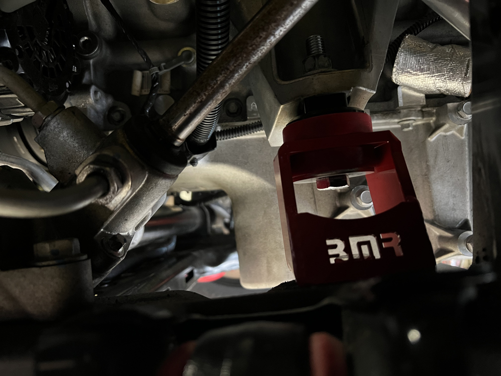 This job took me way longer than it should have, but I finished installing a new set of BMR motor mounts today. The reason it took so long is because the headers were blocking one of the bolts so I wasted a lot of time trying to find a short cut instead of just removing them. Where everything went completely downhill is when I was being stupid and unbolted the headers before disconnecting them from the rest of the exhaust system. The weight of the exhaust made it impossible to bolt the headers back on, and without the headers connected it was next to impossible to take apart the rest of the exhaust. I ended repositioning the headers enough to get one bolt in each one, and then with some heat, a large hammer, and a block of wood, got the exhaust from the cats back removed.