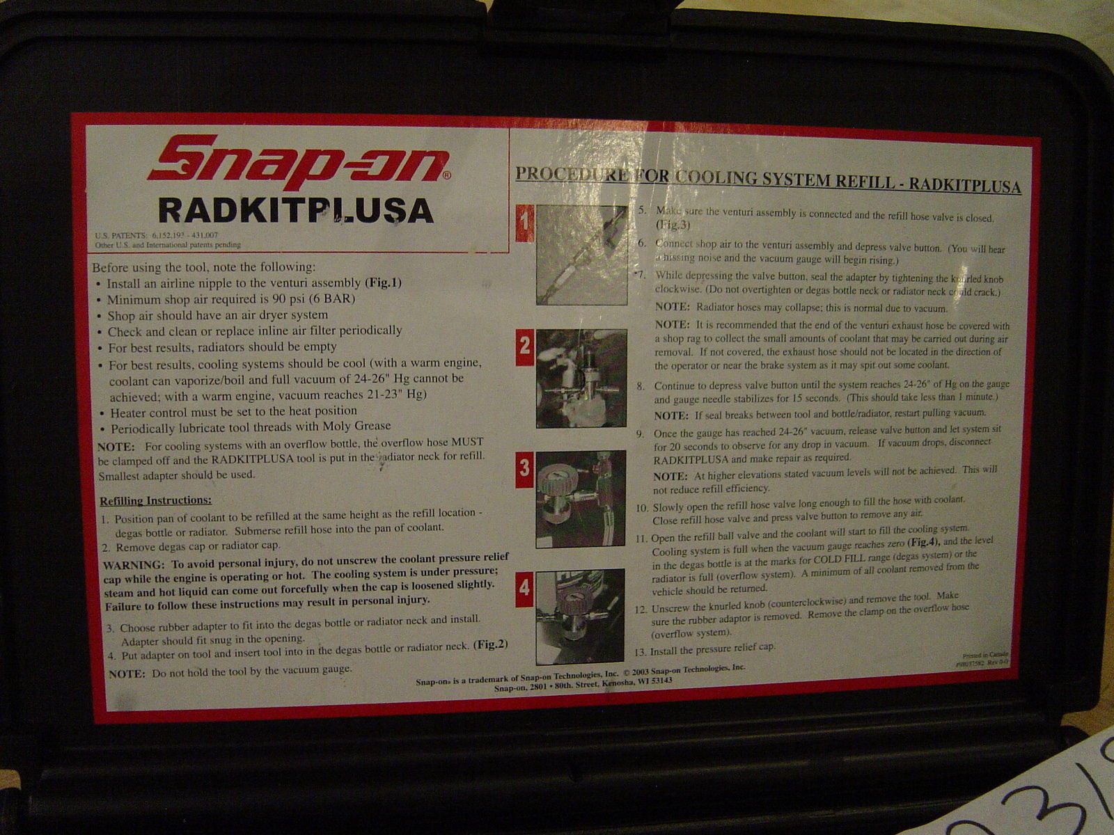 SnapOn RadKitPlusA ![]() ![]() Found the right rubber fitting for the reservoir, plugged it in, setup the unit and pulled the system into a vacuum. Left it for 10 minutes and when I saw no remission in vacuum, filled it up using the same tool! AWESOME tool Instructions: ![]() Here is a vid on how it works... Took it for a drive -- no issues! Now my rebuilt Supercharger is due in Monday and I'll get it ported (NO, I'm not selling the other one ;o)... Next, I'm also working on the vacuum pump -- that will be nice too... -Don