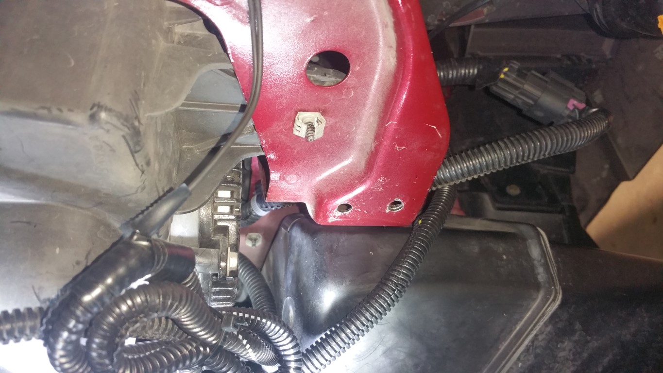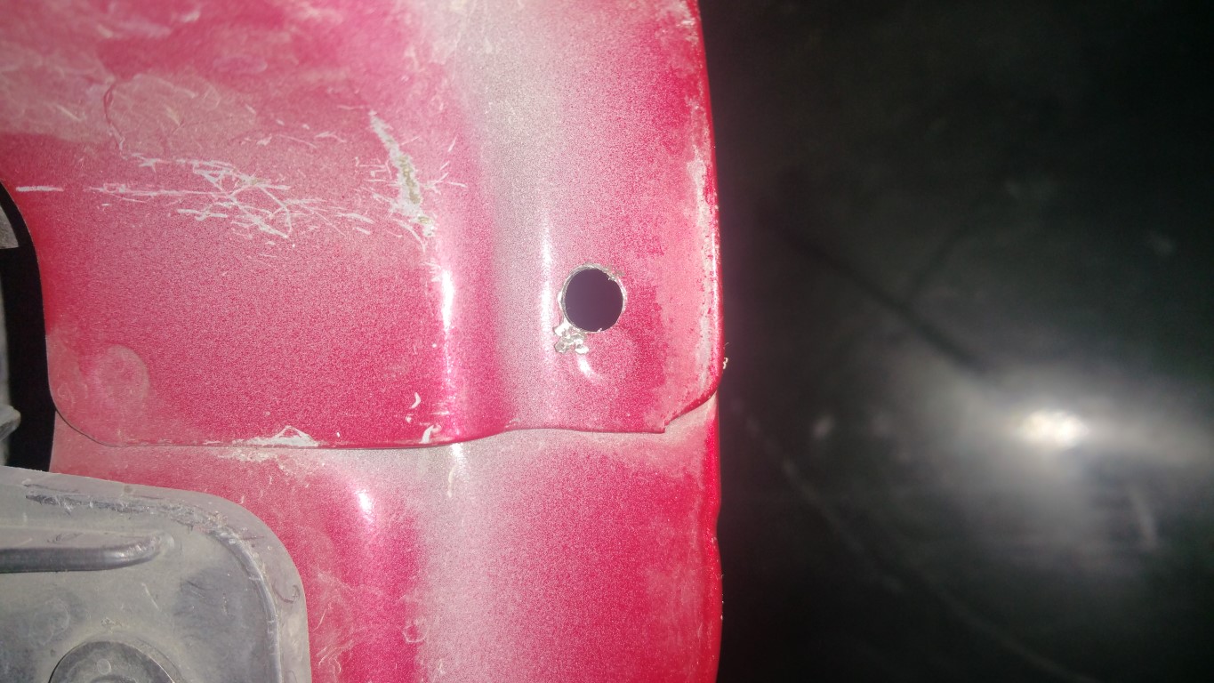 This is a section on the front just next to the passenger's head light -- its a weld location that I drilled out so I could 'mount' the bracket and get the areas drilled up: