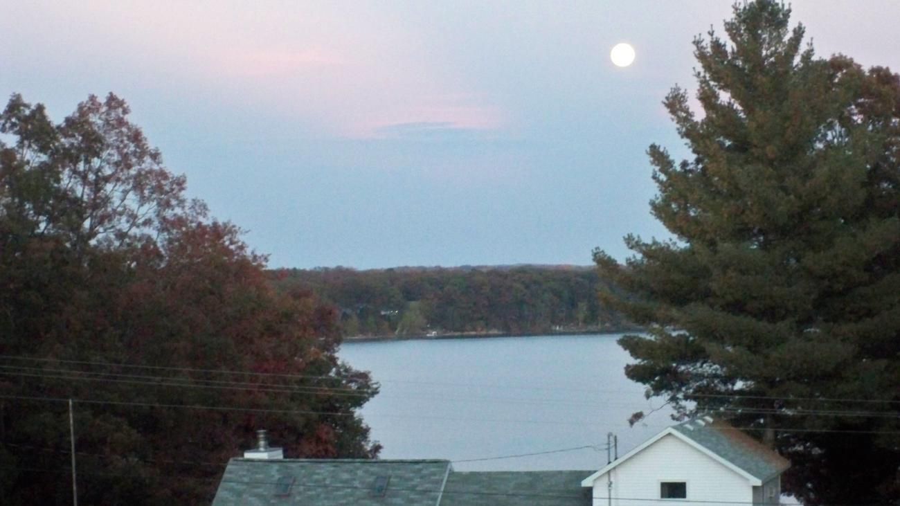 we had the roof sheeted and shingled by some local contractors... too high up for us... glad we just had to write the check on this one. haha. also some pics from the peak... view of my aunts house, my parents house accross the street, my dads barn... which he says looks like a pup tent now. and a few pics of the lake. |