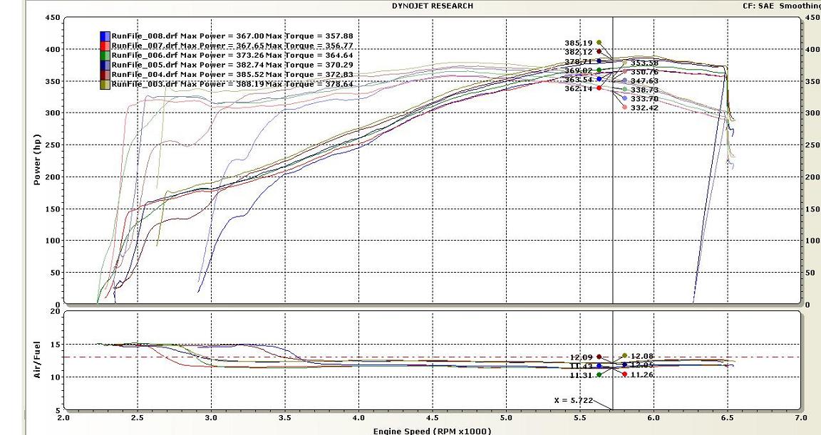 Just so there's no mystery to it, the first graph shows all of the runs. Runs 6-8 are the stock intake, runs 3-5 the JacFab intake... Runs files 1 & 2 are not shown and were failed missions the dyno was not happy with it's failed tach pickup and not working. An optical pickup had to be used so unfortunately the hood had to be left open.