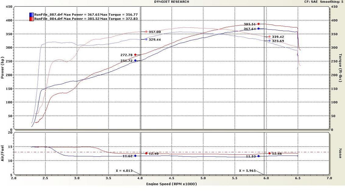 JacFab intake +17.87HP, +16.06TQ. A minimum of 14 ft lbs of torque gained through the whole curve, and up 30 ft lbs in places... An average gain of 17.16 HP (above 3500), and an average of 19.62 ft lbs of torque (above 3500)... WITH NO SCOOP!