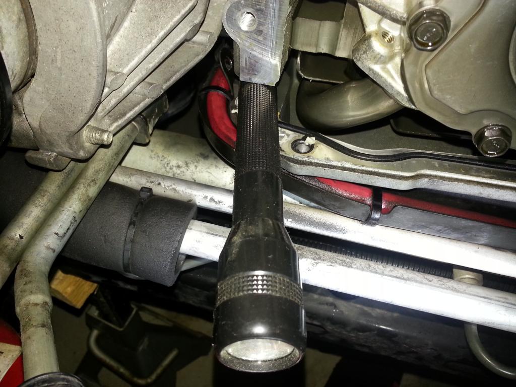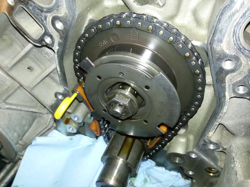 Now I used this: jTo relieve the tension and remove the timing chain and cam gear: ![]() Protecting the pump tube: ![]() Tension relieved: ![]() ![]() ![]() Now, we need to remove the cam bolt (CMP Solenoid — according to the manual, one time use ONLY) using a 24 MM socket -- its on TIGHT: ![]() Gear and chain removed: ![]() Grab from behind and be careful -- don't touch the cam phaser: ![]() ![]() Now, time to remove the tensioner: ![]() ![]() Now, ready for the phase limiter upgrade, then remove the radiator and cam! ![]() -Don Last edited by hammdo; 06-22-2019 at 09:59 AM. |