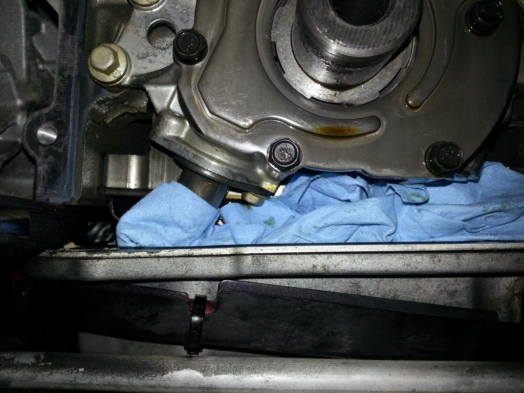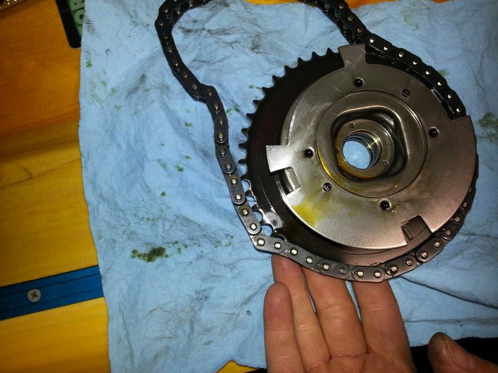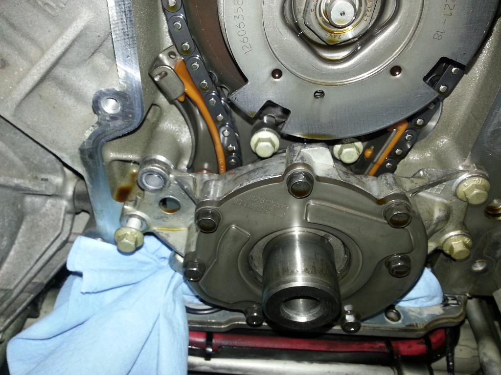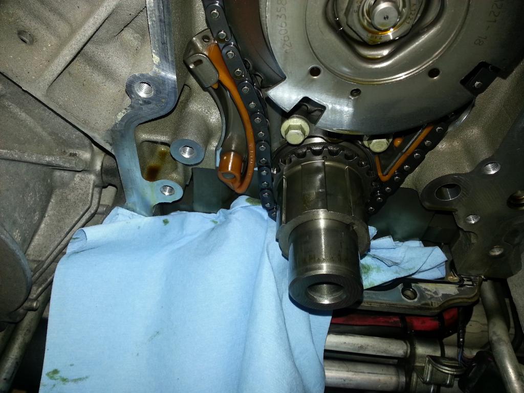Now, I covered up the oil pump pickup tube so I could remove the tensioner and VVT Cam Gear (be careful when remove the cam gear, you grab it from 'behind the gear and NOT the VVT phaser)