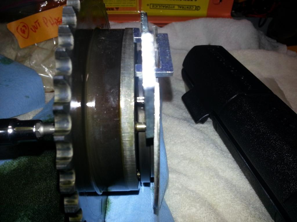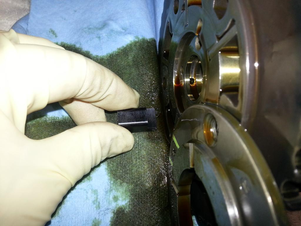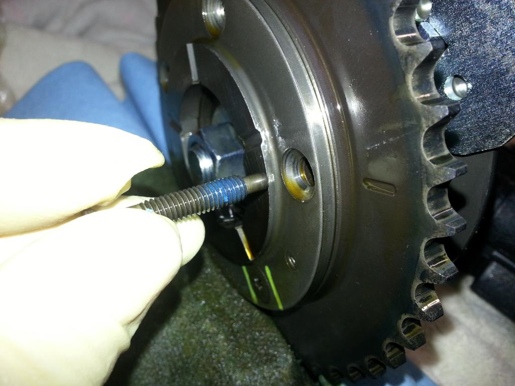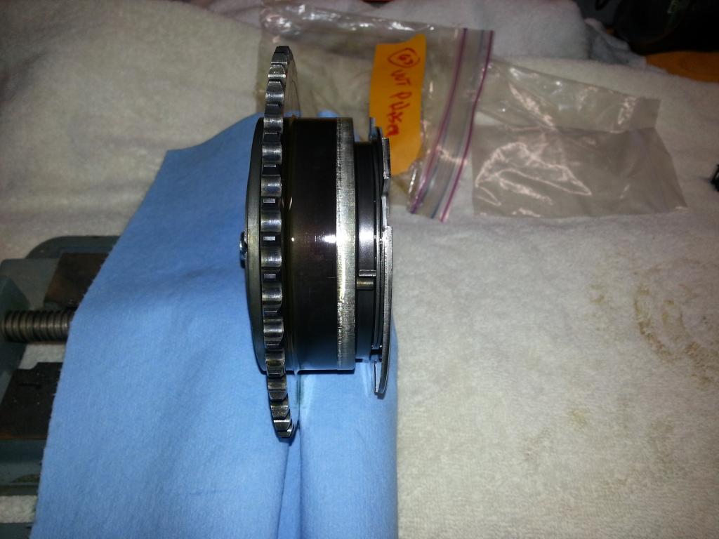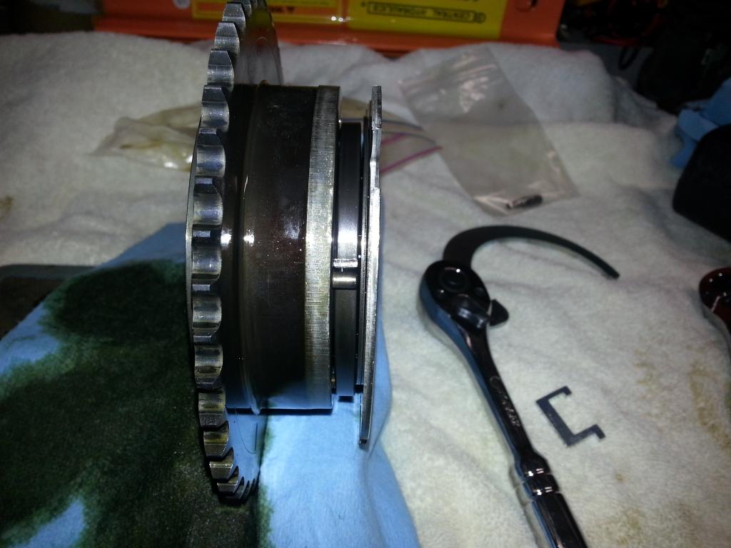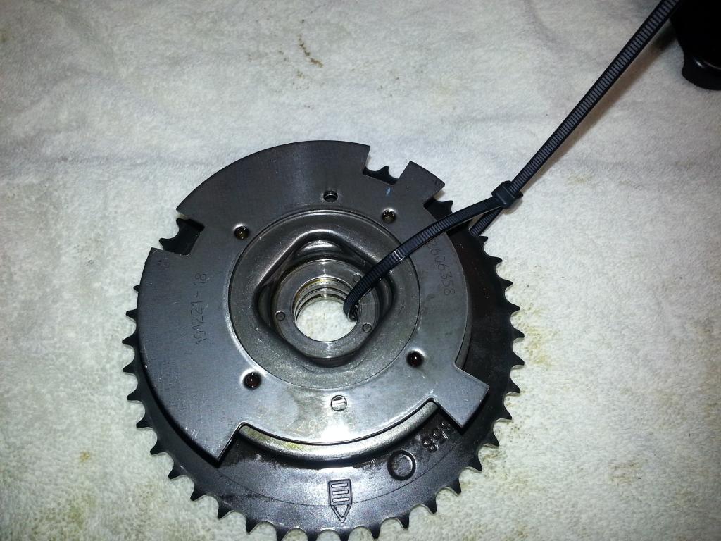![]() Video how to: First we'll need to install the 'safety' retainer on the phase unit: ![]() ![]() Next we'll use the spring compressor to relieve the pressure so we can remove the 'pin' bolt: ![]() ![]() Where we want the tool to be placed to relieve the pressure: NOTE: we have the pin bolt @ the 2:00 location. We want to LOOSEN BUT NOT remove the bolt just clockwise from here: ![]() In vice and the bolt to 'loosen' is marked with the paint pen: ![]() Spring tension relieved and 'retainer' on the tool is now locked in place. Note the spring is no longer resting on the pin bolt: ![]() ![]() This is a special torx bit that comes with the kit -- YOU MUST use this one as it is a 'plus' version: ![]() Bolts removed and the cover rotated -- be prepared for a FLOOD of oil from this thing: ![]() Note how I rotated it to the right and exposed the location where the limiter is going to be installed (@ 6:00): ![]() This is the phase limiter that comes with the kit, it is to be installed just the way you see it laying -- edge facing down in this case: ![]() ![]() ![]() OK, secure the unit again: ![]() Add loctite and reinstall -- NOTE where the pin bolt needs to go (@ 2:00): ![]() Installing the 'pin bolt' -- all bolts are torqued to 85 inch pounds (not ft lbs): ![]() ![]() Now, prepared for install!: ![]() Next step -- radiator and cam removal... -Don Last edited by hammdo; 07-02-2017 at 03:09 PM. |