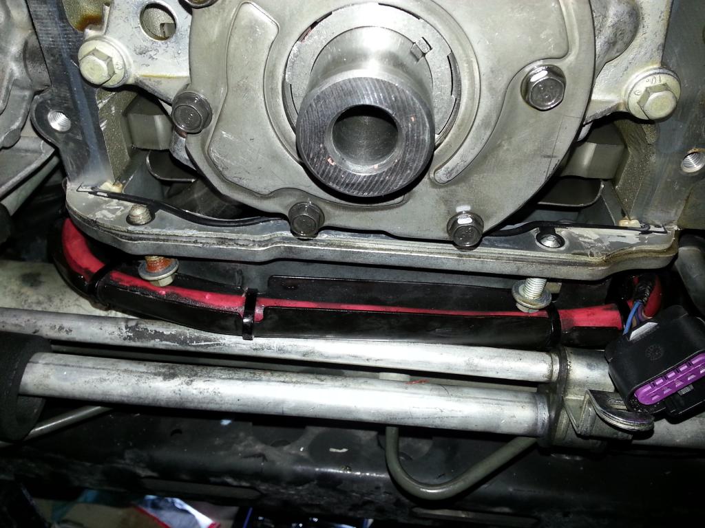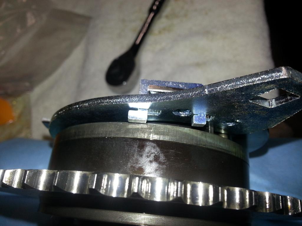 OK, now its time to line things up. I had to lower the flywheel holder as it kept the marks 1/2 tooth off so I just loosened it so it would not hold the flywheel. Once that was done it was install and torque things down!