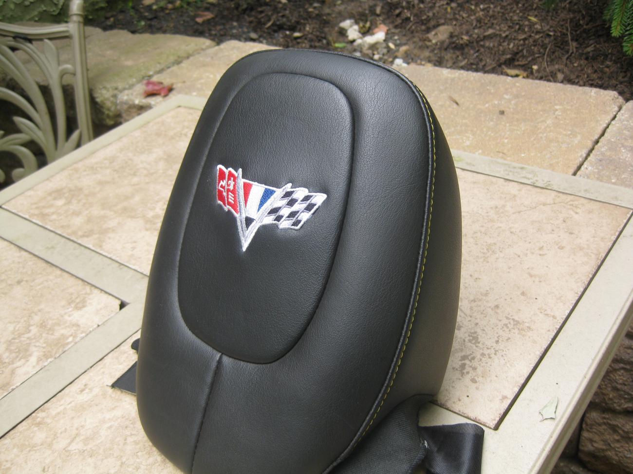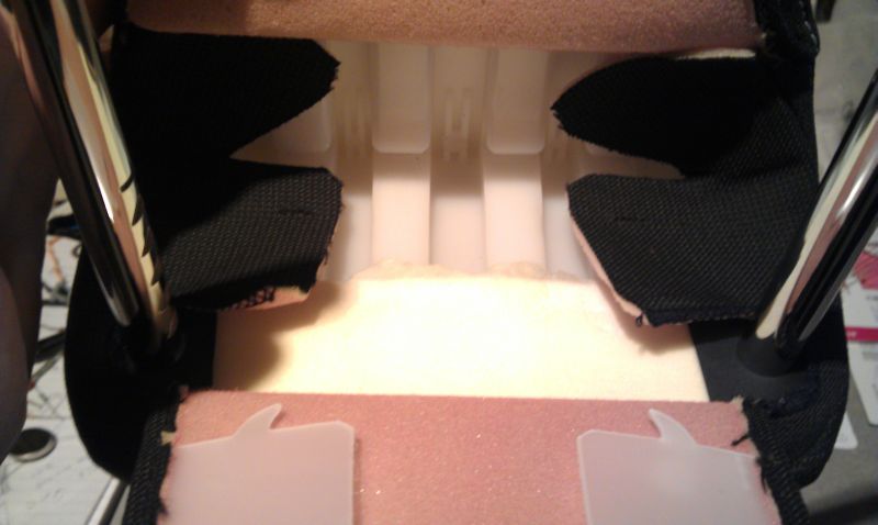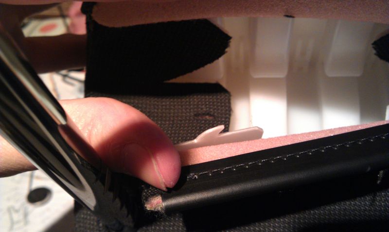 The first one shows the covering on the headrest with the front and back flaps open. Note the channel at the back. This is where the front and back sections come together and snap in.