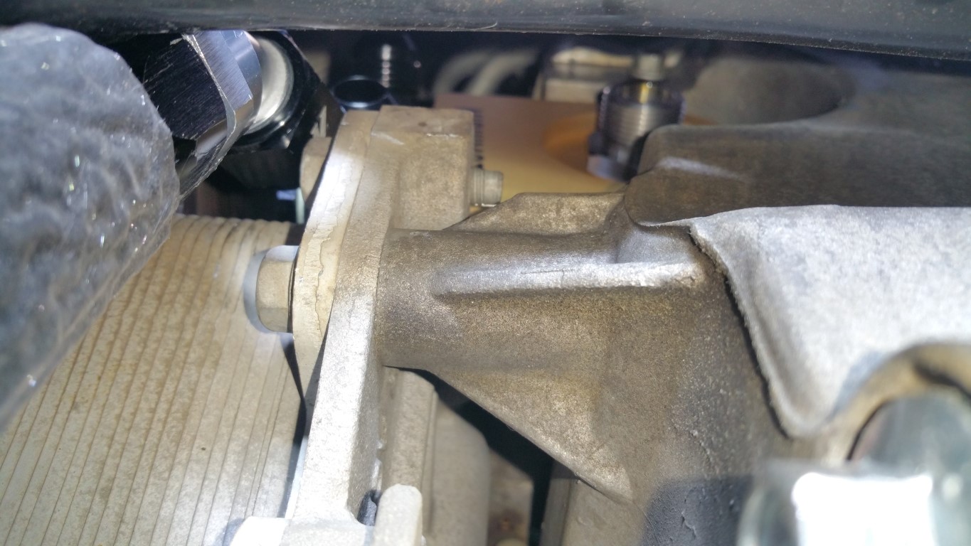 I noted when Mishimoto started the R&D that I have an HX and the Trans Cooler and if there would be any issues or changes -- they didn't think so, but, it looks like that will need to change. Here is my setup with the Mishimoto cooler installed (Note I used 'custom' M8x1.25x90MM bolts I purchased from Home Depot along with spacers): ![]() I also had to bolt down the lower as it was going to hit against the trans cooler: ![]() ![]() Clearance: ![]() Routing the hoses, I had to run this 'above' my heat exchanger and power steering cooling lines. This combined with the extending out of the Oil cooler made the 45° line too short. If I pull the lines tighter, they come too close to the alternator pulley -- not a good thing! So here are my issues; Factory oil cooler does not seem to give enough clearance to tighten up the cooler lines: ![]() ![]() ![]() I'm too close to the factory cooler and, not enough line to 'come' at an angle. The Mishimoto sandwich is really in line with my factory oil cooler. So, I'll send Mishimoto a pm and see what they same, but, right now, I'm taking off the sandwich and lines. Kinda sucks, but I'm guessing its more to do with my additional coolers and lines already in place. -Don