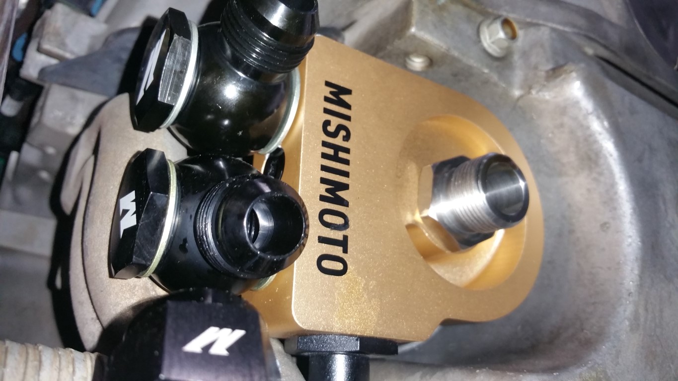 Started the Mishimoto Oil Cooler install today. Cooler went on with no problem the lines and the adapter, different story.