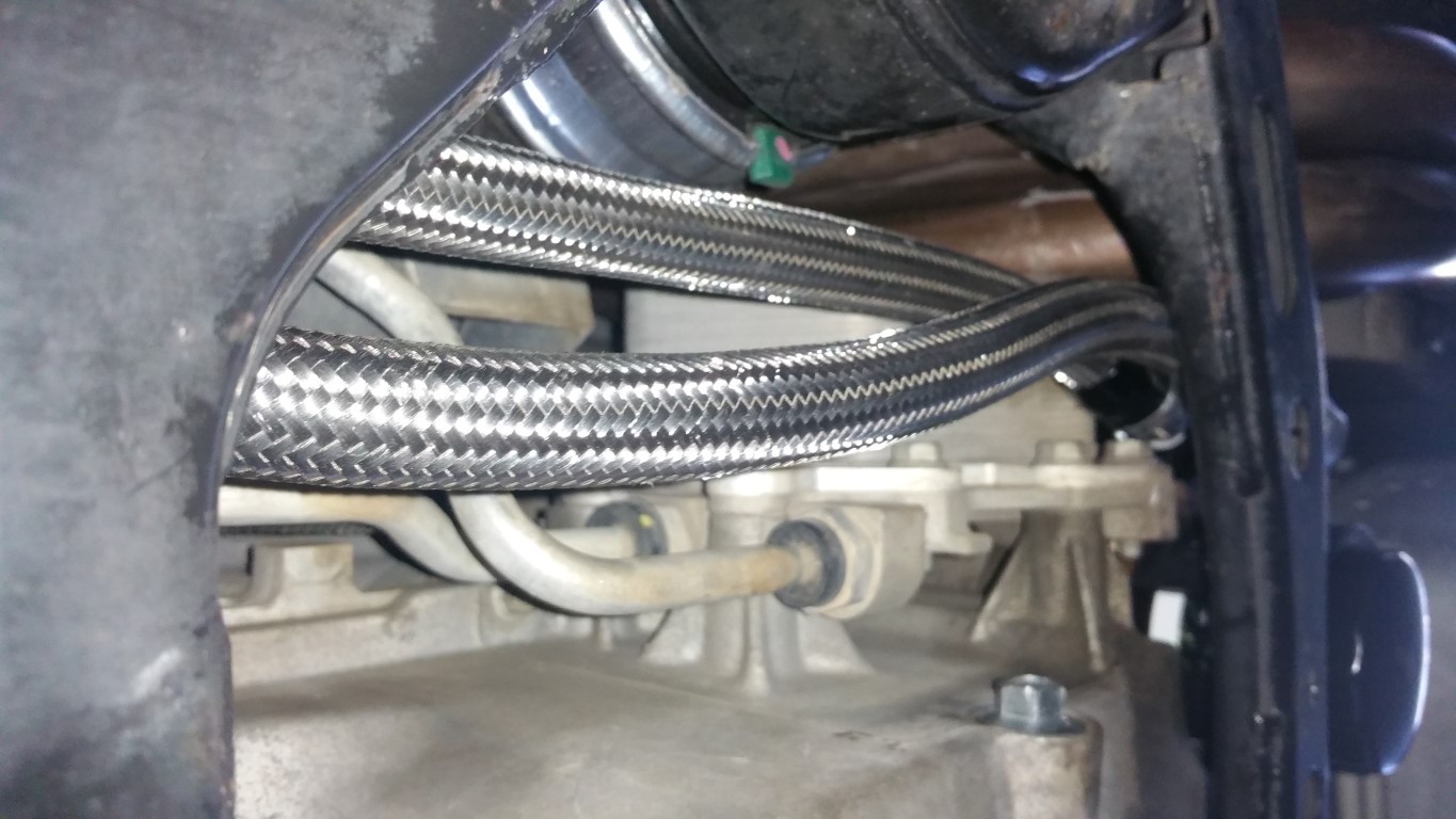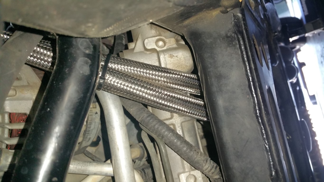 I added hose everywhere else -- 2 places both ps hose. Option for extra line length would be great at a cost of course. I know I'm not the only one that has extra coolers ;o). Zip ties and buffer hoses would be great. In the old days, we had belt guards for hoses, that could be an option. Notice I also bolted down the lower part of the cooler too for clearance. Outside of that, kit is great. I'd also offer an option for a longer cooler. Some may want that if they are not running extra coolers -- like road racers with sticks... Thanks! -Don