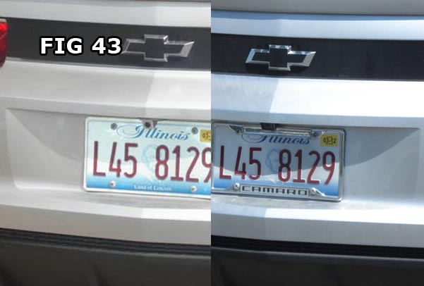 Fig 38; mounting it from inside the bumper, I needed to trim down the flanges on this camera. The area between the plate lights is recessed up there. So this needs to fit down in. I took about 1/4" off each side.