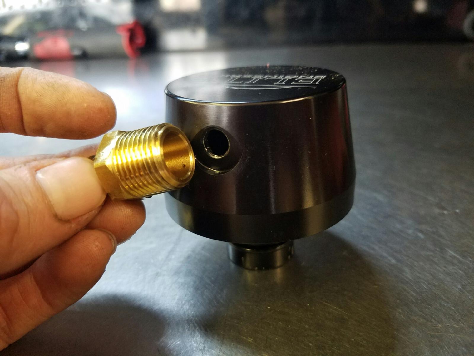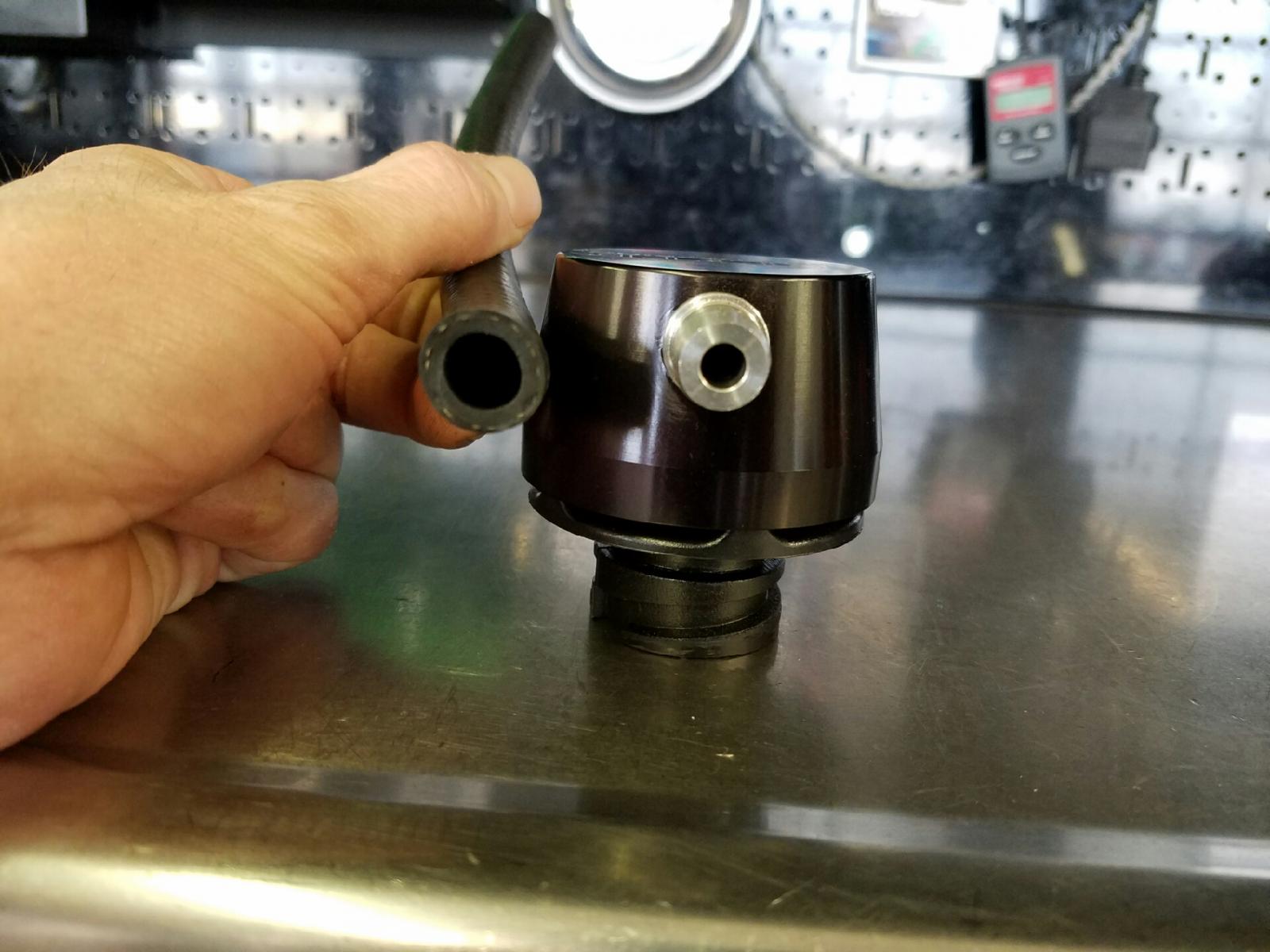 And here is the -12AN oil cap from MM, just a tad larger than the -6AN one I used to run before. I this should all work well together and allow both banks of the engine to freely breathe when in heavy boost but yet seal off the passenger side during idle and cruise so the evac system can work like stock and pull vapors across the engine in from one corner and out the other.