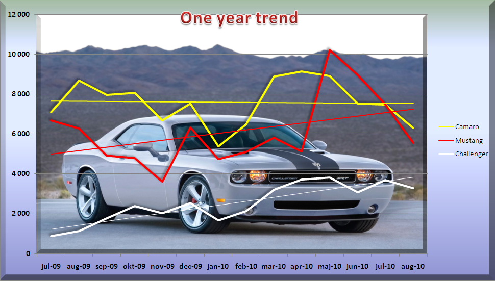 love these graphs. man, the Camaro is flat-lining! but overall very steady and we're back on par with the Mustangs and looks like they have fallen sharply. Right around the time the 2011 Camaros came out, notice the sharp decrease in Mustang sales!! Challengers have a healthy curve though.