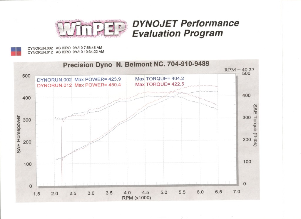 First dyno pull ever 3/19/10 on AWD dyno at 3SX Performance (K&N intake, 3" Magnaflow catback, no tune): 378.3 RWHP 373.5 RWTQ Dyno run on 5/7/10 on Dynojet dyno at Total Performance (K&N intake, 3" Magnaflow catback, no tune): 376.84 RWHP 367.38 RWTQ Temp 89F Best dyno run on 6/26/10 on Dynojet dyno at Total Performance (K&N intake, Doug Thorley 1 3/4" shorty headers, SOLO hiflow cats, 3" Magnaflow catback, HP tune): 404.03 RWHP 393.47 RWTQ Temp 100.5F Gain of 27.19 RWHP and 26.09 RWTQ from 5/7/10 Dynojet run NOW, for today's results: First dyno pull today after warmup 9/4/10 on Dynojet at Precision Dyno (K&N intake, Doug Thorley 1 3/4" shorty headers, SOLO hiflow cats, 3" Magnaflow catback, VMS Stage 2.5 cam kit (LSA Comp Cam 227/239 on 114 .613 .623), no tuning): 423.9 RWHP 404.2 RWTQ Approx Temp 72F Gain of 19.87 RWHP and 10.73 RWTQ from previous 6/26/10 dyno run prior to cam. So after this, we started tuning and doing more runs. I was in the driver's seat which was a blast!! Thomas was tuning on the HP. First main thing was to increase the idle speed, it was idling at 500 rpm. We started high adjusting it to 900 rpm, but was too high, couldn't hear the lope. We ended up bringing it down to 775 rpm and was perfect. We ended up running the a/c later, and ran great, we drove around town, never stalled once. Just the right amount of lope, not shaking nearly as much, alot smoother and sounded awesome (will do a video tomorrow). I couldnt' take but 2 photos and no video since my batteries died in the camera. Next thing we noticed was that car was running rich. I noticed a stout gas smell after the cam was installed. The a/f mix was at around 11.8. We leaned it out up to 13.8, it didn't really like it and we found the best spot the car liked was around 12.7 to 13.1 a/f ratio. So that's where we kept it. Next we checked the temps when the coolant fans would come on and adjusted them to come on at 45% power at 175F, up through 90% power at 215F (Thomas, correct me if I'm wrong on this). We started running into problems hitting the rev and/or speed limiter so we raised the electronic speed limiter to 170 mph. We were getting the car kicking into safe mode after getting the high speed warning and reducing engine power. It would come on right around 6400-6500 rpm. So after that was fixed, we didn't get the dash messages anymore. Torque management was shut off from before, so no change there. The last thing was modifying the timing. We started with -2 degrees of timing and the car liked it and responded well. We ended up taking out 1 more degree, total of -3 degrees of timing and that's where we ended up and had our best dyno pull of the day: 450.4 RWHP 422.5 RWTQ Approx temp 80F Now based on the actual conditions at that time, it was 460 RWHP (STD), but I know people freak out when you don't use SAE! That was a gain of and additional 26.5 RWHP and 18.3 RWTQ in just tuning from the first pull earlier in the morning. So overall, from before the cam was installed, we saw gains of 46.37 RWHP and 29.03 RWTQ with the cam tuned! I'm very happy with the numbers. I was hoping for 450 and got it So with an average 15% drivetrain loss considered, I should safely be in the 500 bhp club (~518 hp at the crank and ~486 tq). It's a good feeling.So with all mods (do not have a run w/o the intake or catback exhaust), based on the 5/7/10 "baseline" dyno, I've seen gains of 73.56 RWHP and 55.12 RWTQ, so likely a few more ponies prior to the intake and exhaust. I can't complain about that! Overall I'm really happy with the cam tuning results and performance gains. Thanks to Thomas at Precision Dyno for the fantastic tuning job and much thanks to the guys at Vector and Comp Cams. Now to get to the track and put these numbers to the test! Graphs are below in chronological order with today's last.