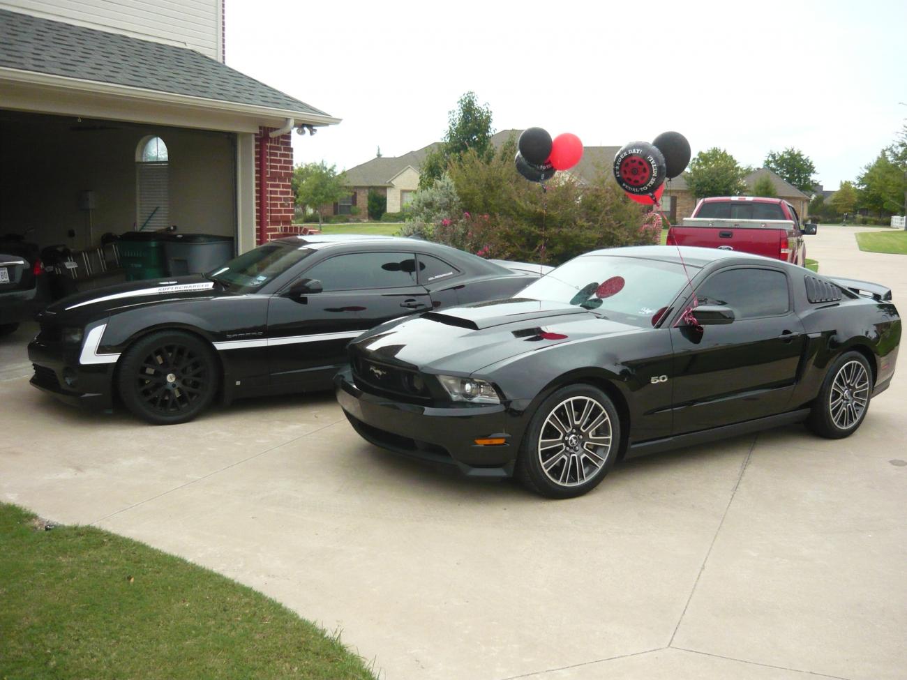 My son's friend brought his brand new 2011 Mustang GT 5.0 over to show it off.. It is a very nice looking car.. Interior looks Bad@$$.. I wouldn't trade my Camaro for anything.. Here are a few pics of them side by side !!