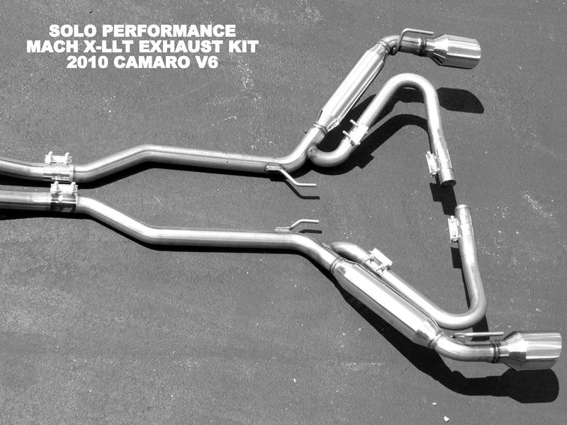 The Mach X-LLT exhaust kit for your V6 Camaro, Auto or Standard, is a full stainless steel unit. The muffler and tips are T304 and the pipes are T409. The band clamps we use are T304 as well. There is a lot going on in this exhaust kit to get the Camaro V6 to sound like it should. First we have a special Solo X design Mach free flow muffler in the front. As with most X pipes, this X muffler doesn’t inhibit the flow and does a great job of calming the noise. We also have a rear set of free flow Mach resonators in the tailpipe section. These resonators are the same free flow resonators used in our V6 Res-Cats. These resonators, or mini mufflers, also reduce and calm the overall exhaust note.