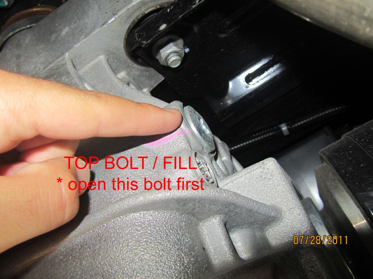 First off the fluid smells horrible, OMFG. I gagged so much, maybe my nose is sensitive, but this fluid, both old & new smell so bad. I'm attaching some pictures for you all to see how simple it really is to change this fluid. 1. Put the rear tires up on jacks. 2. Loosen the top & bottom bolts with a socket wrench but leave the bolts in. 3. Use your fingers to remove the top/fill bolt. 4. Use your fingers to remove the bottom/empty bolt. Into a catch can of course. 5. Drain until empty. 6. Clean the bolts with a rag. 7. Tighten the bottom bolt back into place 8. I maneuvered the bottle of AC Delco 75W 90 and squeezed until the plastic bottle was empty. 9. Tighten the top bolt. 10. Clean your hands cause they smell like a$$. Pretty simple process, about 30mins total and now I feel more proud of my car cause I did it myself & I saved a few dollars. |
