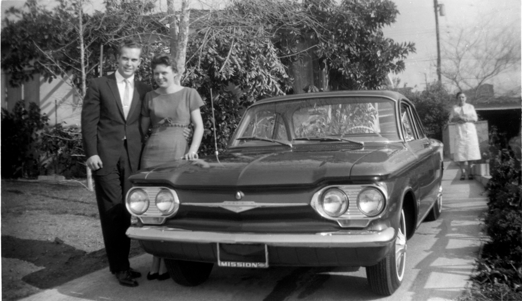 This is my Mom and Dad and his brand new Corvair Monza. That's Grandma in the background keeping an eye out....