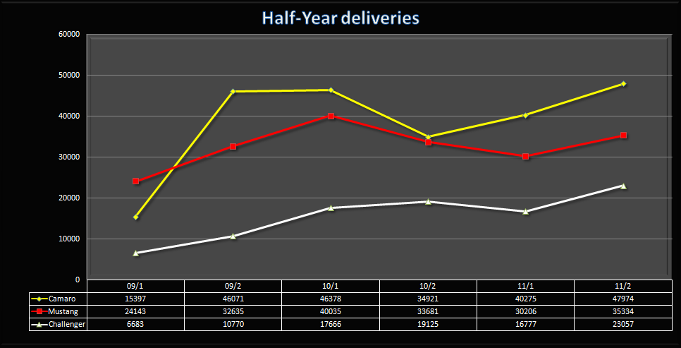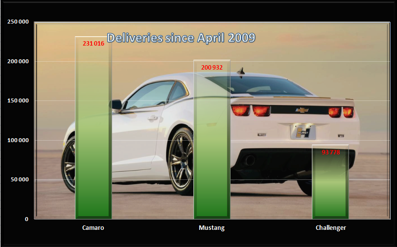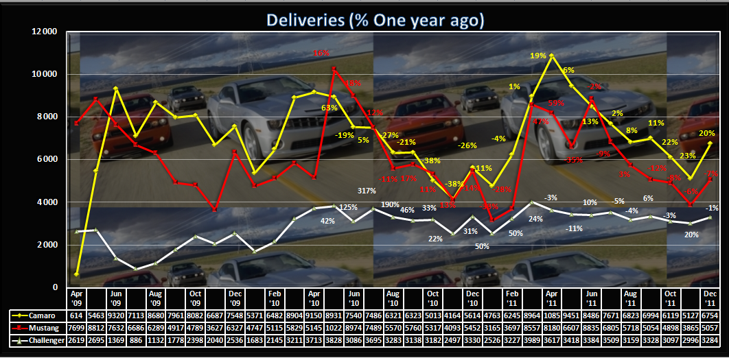 Camaro December 2011 Deliveries (actual sales): 6,754 Total Deliveries in 2011: 88,249 December 2011 Production Stats: Camaros Produced in December 2011: 7,256 2012 Model Year Produced Through November 2011: 47,773 Compared to Competition: Mustang sold 5,057 units in December 2011 Challenger sold 3,284 units in December 2011 |