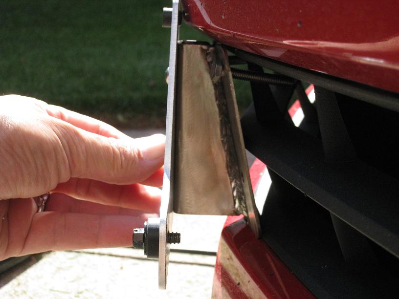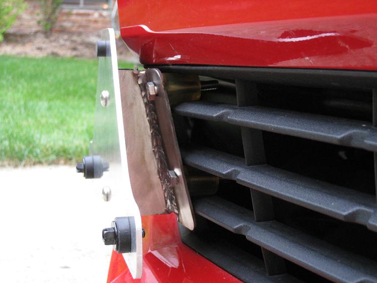 I got my prototype front plate mount. These aren't the best pictures, but I wanted to post them up so you can at least get some idea. The back plate will mount behind the lower grill and the clear rubber bushings will keep the front portion from crushing the plastic of the lower grill. I hope to have some pictures of it on a car soon.