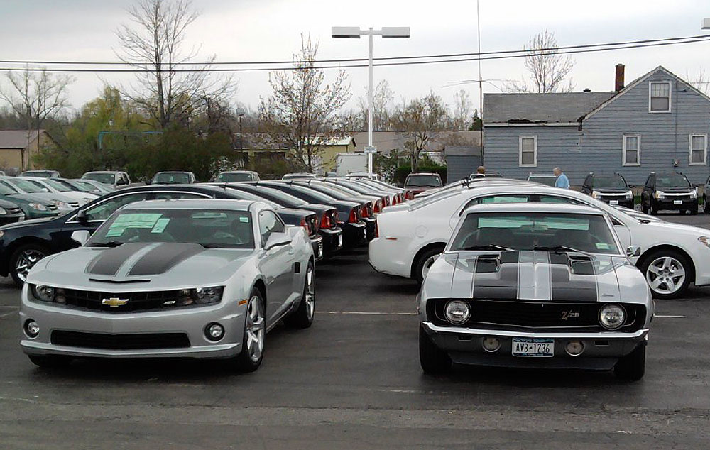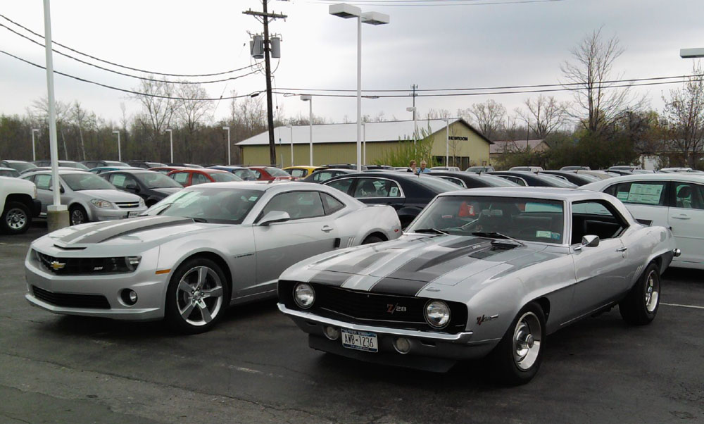 This was a once in a lifetime opportunity. ![]() I got a call today by my mother, and she said there's a Camaro at Joe Basil Chevrolet, in town here...so I head down there, asap -- and I pull in, and spot a beautiful silver 2SS with polished rims and black stripes. MSRP $35-somethin'. (It was right next to a black Corvette convertible, and I have to say -- I really do think the Camaro has more of a presence than the Vette. )Anyways, the car JUST came in...it was no more than an hour between the call, and when I got there...by the time I pulled in -- the car was sold (with a $2500 markup) Another guy pulled in as I was standing there drooling, and he was in an identically-colored 1969 Z28. I almost fell over. He asked the new owner if he'd pull them up next to each other for pictures...and the guy was cool and said "yeah". There were at least 7 other people besides me with Cameras.![]() These images are impressive...when you consider it's been 40 years between the the 1969 and it's design-inspired new sibling. The Camaro brand has come full circle and ready for another 40 years. ![]() Having not seen one in person for almost 4 months, now...this revisit reminded me just how much I HAVE to have this car. ![]() Enjoy! EDIT: When he turned it on to move it (LS3)...it was a heavenly serenade. Quieter, but better than the '09 Mustang, imo. ![]() |