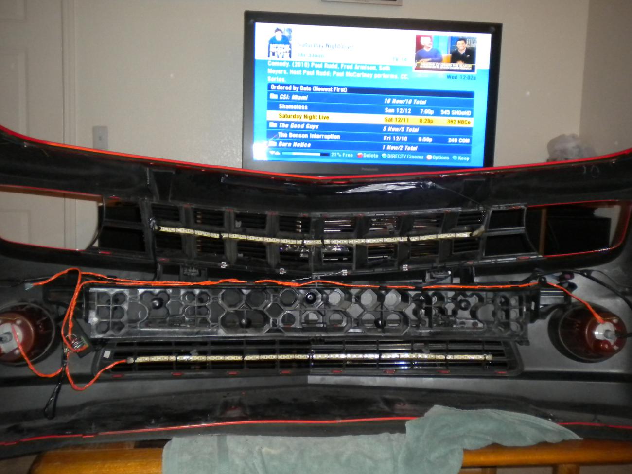 Pic's show bumper off, fog's cut in half with the dremel I had to drive and get, un-wired bumper and finished wiring job, and finally the finished product. Does all colors, but sickest in red