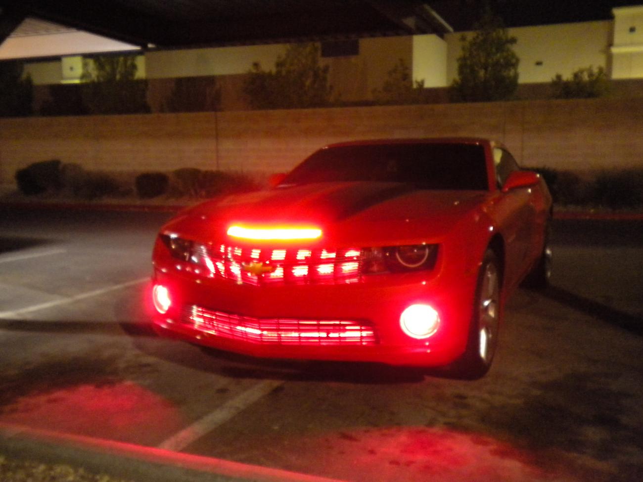 So this was, and still is one of my largest undertakings. I had seen some color change fog lights and thought, "that's cool, but I can do better" In researching them I found the Knight Rider light and weatherproof RGB strips. This was before they used 5050 RGB lights in the fog's, but it's to late now... lol and I like the lights rotating around as they change. I used one controller to do both fog's and both RGB strips mounted facing rear behind both grilles. I liberally used zip ties and wrapped my work in Orange for obvious reasons. The install went great, except the pic you see with bumper off and lights on was me heading to Home Depot without a front bumper I sat in a lawn chair playing with them all night long after I finished. Oh, and I worked from 9am to 2am with breaks for food and such. And it was cold!!! Well for Vegas.