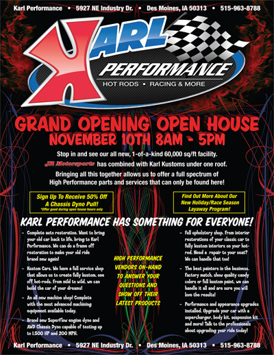 We invite you to the Karl Performance Open House: Saturday, November 10th from 8am - 5pm. This Grand Opening is your chance to tour the all new 60,000 sq/ft facility that is home to Karl Kustom Corvettes, the area's most advanced-all new machine shop and SuperFlow engine dyno and AWD chassis dyno.