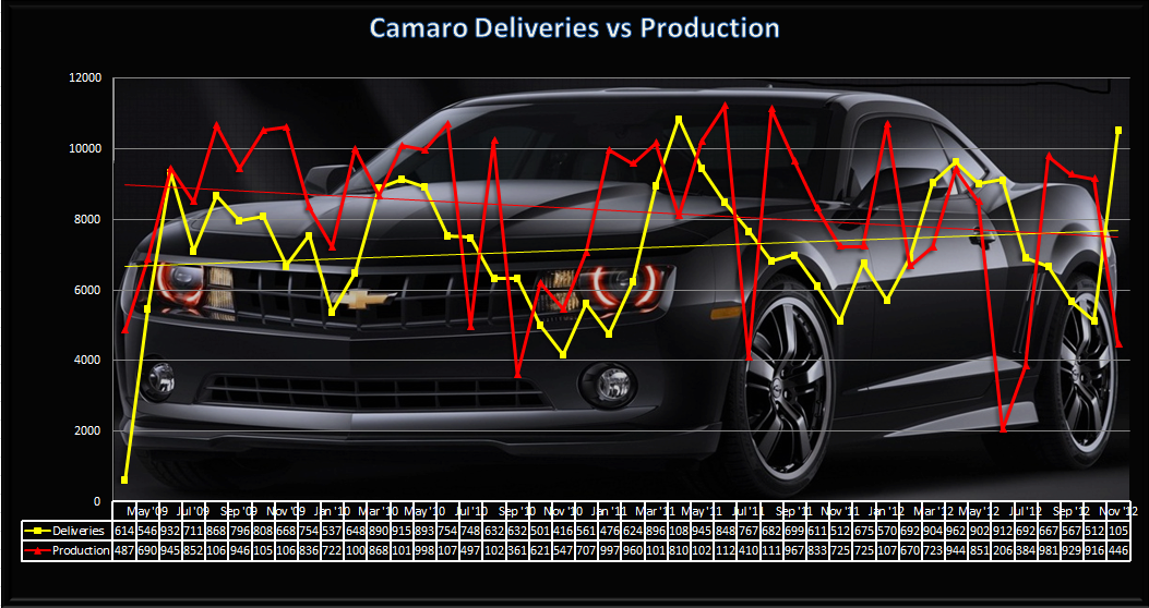 Camaro November 2012 Deliveries (actual sales): 4,464 -13% (Pr Ye) November 2012 Production Stats: Camaro Produced in November 2012: 10,529 Compared to Competition: Mustang sold 5,309 units in November 2012 +37% (Pr Ye) Challenger sold 2,868 units in November 2012 -4% (Pr Ye) Last edited by Enator; 12-03-2012 at 11:51 AM. |