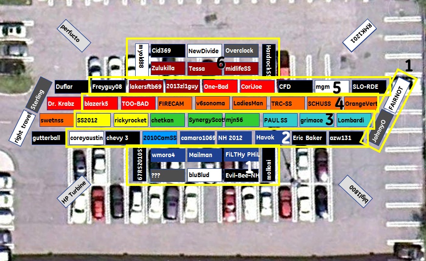 This will be the place holder, but we'll start with the basics: Show: Rhode Island Chevy Owners Association All Chevy Car Show Date: June 30, 2013 Place: Diamond Hill State Park, Cumberland, Rhode Island Time: 9:00 - 3:30 (we'll shoot to roll in around 9:15 or so, based on last year) Afterparty: ![]() Like the last three years, we CANNOT miss this show! We've take the trophy for best club participation three years in a row. Two years ago we were given our own class for the fifth generation Camaros, and last year, we even had a stock / mod split for our class. The first year we went in with 20 cars. Last year we went in with with 48 or 49 cars! I said it last year (and I was a little disappointed) - we have to be able to go in with at least 60 cars!!! And let's not forget the looks on everyone's face (especially the Corvair Club) when we all pull in as one group. Oh yea, for those of you new to NEC5, we roll together. That sig pic down there didn't just take itself. The last stop of our rolling caravan before we go into the show will be at the Emerald Square Mall where we'll line up again in some formation for a "class picture". Get the word out - save this date - sign up as a member here online if you haven't already. My clipboard (with the NEC5 logo on it) will be in full force This is really important, especially for those of you meeting us at the show - When you fill out your registration, be sure to write in "NEC5" for the car club!!! LINK TO LAST YEAR'S PRE-SHOW THREAD LINK TO LAST YEAR'S POST-SHOW THREAD(which made the Camaro5 home page, BTW) Who's In - 72 Signed up Meet at Burlington B & N 1. 2013zl1guy 2. azw131 3. camaro1069 4. Cid369 5. Eric Baker 6. Evil-Bee-NH 7. FiLTHy PHiL SS/RS 8. FIRECAM 9. JB12ZL1 10. Mailman04222 11. MAJORSS 12. midlifeSS 13. molloni 14. NH 2012 SS/RS Meet at Hopkinton DD's 15. 2010CamaroSS/RS 16. 67RS2010SS 17. bluBlud 18. chetkan 19. chevy 3 20. coreyaustin17 21. CoriJoe 22. Duflar 23. FAIRNOT LZ1 24. Freyguy08 25. gutterball 26. Lombardi 27. mgm 28. mjn56 29. One-Bad-ZL1 30. Overclock 31. perfucto (Chris) 32. SCHUSS 33. SLO-RDE (Doug) 34. SynergyScott 35. Tessa 36. TOO-BAD 37. TRC-SS 38. wmora4 Meet at the E. Square Mall 39. 95RedCamaroz28 40. blazerk5 41. BLKWidow / Zulukilla 42. Camfreek1 43. CFD 44. Dr. Krabz 45. grimace 46. HardrockSS 47. Havok 48. HP Turbine 49. JohnnyO911 50. LadiesMan217 51. lakersftbl69 52. Maxspeed 53. NewDivide 54. OrangeVert 55. PAUL SS 56. rickyrocket 57. rjs1195 58. SS2012 59. Sterling 60. swetnss 61. v6sonoma Meet at the Park 62. 2ndtimess 63. Jimi Need to let me know where you'll meet us 64. B1976 65. Danb79 66. mpolaris111 67. myold88 68. right to travel 69. RMK1201 70. RogerBzSS 71. SheWolf 72. Z28 Autobot Maybe 1. 93B4C 2. BluesSinger212 3. Crashnburn7 4. dkbmx993 5. gblaue 6. jmonette04 7. Mick 8. MrsPatfan1987 9. terry_b 10. Vangres Can't Make It 1. 2010CamaroRS 2. 2012-2SS 3. blgl1800 4. eb_ss 5. irocnroll 6. PaulSS376 7. stt81 WHO'S IN??? ![]() _ my EDIT button update 1 - post 109, page 5 update 2 - post 236, page 10 update 3 - post 303, page 13 update 4 - added rally points update 5 - post 346, page 14 update 6 - post 396, page 16 update 7 - post 411, page 17 update 8 - post 465, page 19 update 9 - post 494, page 20, added layout info updated 10 - post 529, page 22 RALLY POINTS For those of us coming from "the North" Barns & Nobel, Burlington, MA, leave by 7:15am We will be meeting near the Burlington Mall off of 128/I95 (and Rt3) and roll out by 7:15am. We are not meeting in the mall, but in the parking lot between Barns & Nobel and Chili's. If you are coming on 95S, you will take exit 32B for Middlesex Tpk, Burlington, Arlington. As you come off the exit, stay to the right and merge onto Middlesex Tpk. You will drive just past the B&N (on your left) to the first light where you'll have to get into the left lane to make a U-turn, then move to the right to turn into the parking lot. I would say to pull into the Chili's lot facing the road. If you are coming down Rt3S, take the last exit, Exit 25A for I95N, Rt3S. You'll follow that loop down and watch for the signs for the Mall. Google Earth doesn't have good pictures for this part of the interchange, but keep your eye out for Middlesex Tpk. As you get off the exit for the mall and the turnpike, stay to the right. You'll merge onto Middlesex, pass under the interstate and stop at a set of lights. At that set, you should see B&N up ahead. Again, move to the left, and at the next set of lights, take the U-turn and move right into the Chili's parking lot. See the overhead or 3 and 95 with the thumb tack for the B&N and Chili's Meet up point for those of us coming from the North and West Dunkin' Donuts,92 West Main Street, Hopkinton, MA 01748-1642, leave by 8:00am This is the first exit off of I495 South after getting off I90. There is the DD's and the side street behind it. There is plenty of room for all of us there as we found out last year. There is not enough room in the DD's lot...soooo....who ever shows up first, say the first 3 or 4 cars, park in the DD's lot there, and then have everyone else line up in the street just behind the DD's. It is Elm St. Direct the rest of the cars onto Elm street. We'll line up on the side of the road there. We should plan on leaving here by 8:00am for the mall. If you are coming from the Mass Pike, take the Exit 11A for I495 After the toll booth, be sure you stay to the right for I495 South Take I495 South to Exit 21A, West Main Street, Hopkinton. It looks to be the first exit after getting onto I495S After coming off the exit, watch on the left for what I think is a Mobile on the Run with a Dunkin inside. It's the first place you can turn in left, so you can't miss it. There isn't enough room in the lot, DO NOT PARK IN THE LOT, but rather we line up on Elm St right behind the gas station. From here we'll go to the Emerald Square Mall... Final meet up point for those of us heading to the show together Emerald Square Mall,999 S