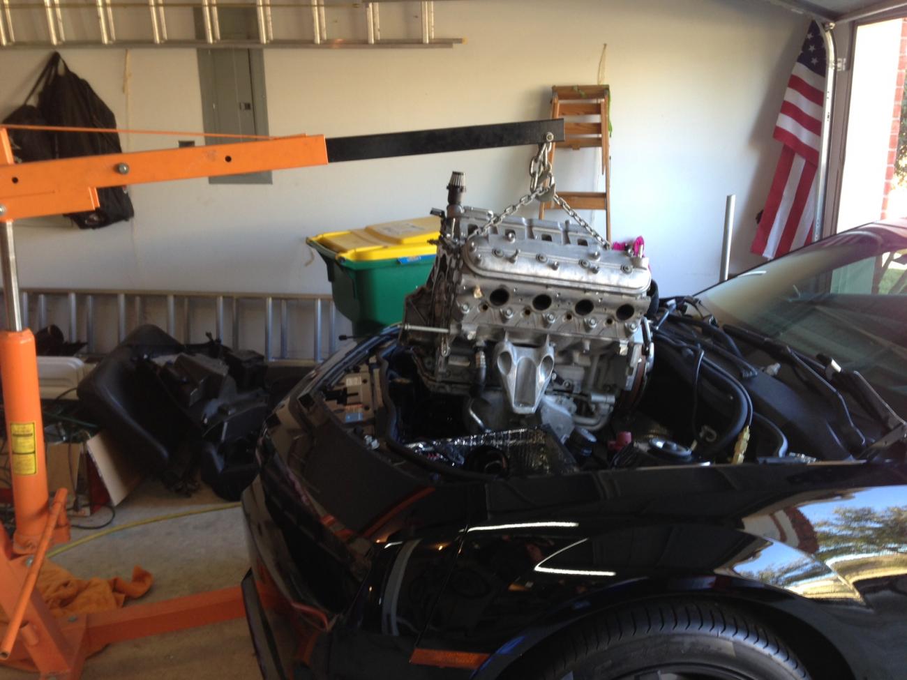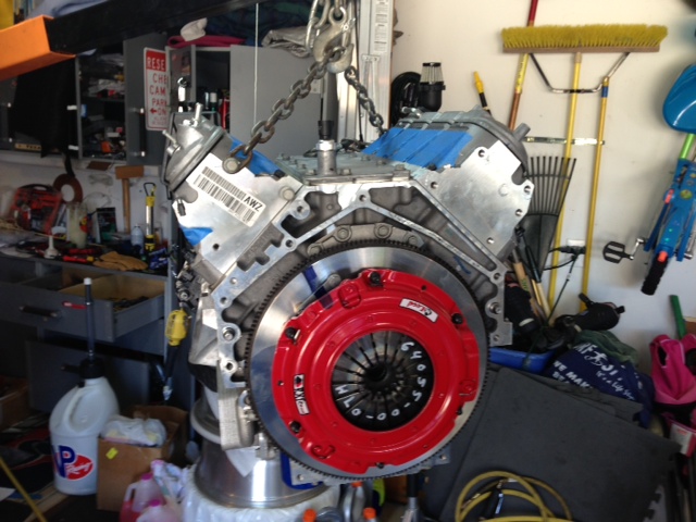 Had my friend meet me when I got home and we got to work. About 7 hours later, we were done underneith the car (I hope). We installed the new RXT clutch, dropped the engine in, installed a tick remote clutch speed bleed line, reinstalled tranny, drive shaft, headers and exhaust! Attached most of the bolt-ons up top as well (besides the whipple and coil packs due to waiting on parts).