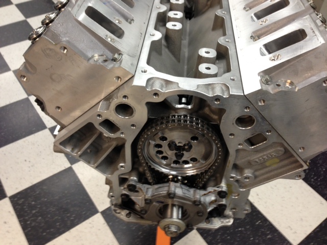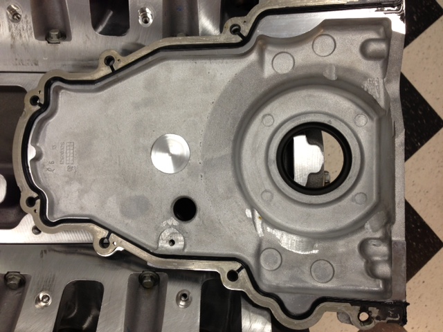 Showing off the double roller timing chain, and new LS4 (high volume) oil pump. Also shows some of the mods on the front cover to fit all the new stuff in. The new 10-rib ATI balancer was installed at the shop to center up the front cover, but for some reason never snapped a pic.