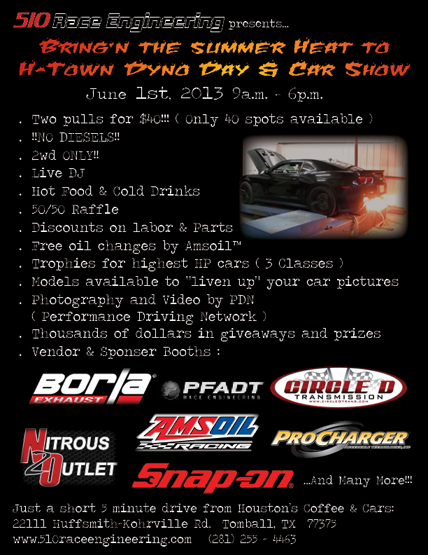 A dyno day, car show and photo shoot June 1st at our facility. We are a short 5 minute drive from Houston Cars n Coffee. Chances are we will go much longer than 9-6 and do well over 40 cars. Essentially a night meet is plausible. We have thousands of dollars worth of giveaways! Tours of the shop will also be available. Please come out meet the crew, enjoy some good food, music, and company! We look forward to seeing you guys all come out! Thank you! Last edited by Randy510; 05-10-2013 at 11:18 AM. |