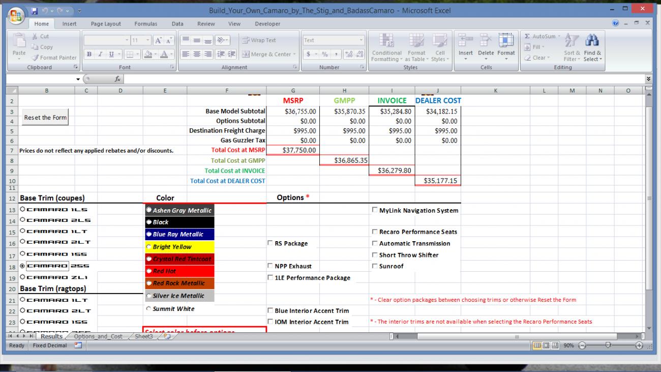 Made an Excel spreadsheet that does all the pricing/options stuffs for the camaro - my solution to the slightly confusing pricing spreadsheet (not that I'm not grateful for it of course). Basically it's the exact same this as the "Build Your Own" page on the Chevrolet website - minus the fancy graphics and rotating image. It's a macro-enabled Excel spreadsheet with Options/check boxes that gave you your 2014 order total.