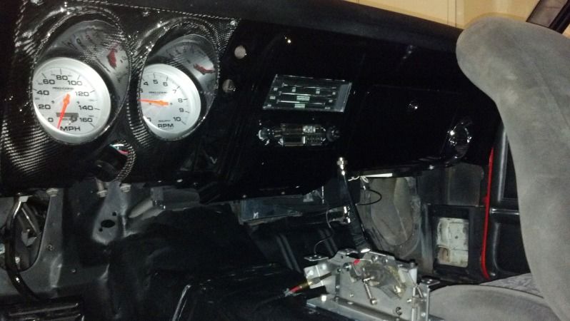 I used the factory 68 Camaro center dash panel with a aftermarket Metra single DIN mount molded it in and had a Local company here (Sin City Hydrographics) dip it in black carbon fiber, then used both 220grit sandpaper and scotchbrite pad to give the perimeter the "brushed" aluminum look to match the Twist Machine shifter handle for the T56 The center console is from a 2013 Camaro, but I took my old Autometer 4 gauge pod from the stock 68-9 center console and fab'd & molded it into the Gen 5 Camaro 6spd shifter bezel (had a tray with no gauges) filled in where the factory traction control switch went and drilled two holes for my heated seat switches Then had the crew @ Sin City hydrodip them The seats were recovered in black leather and suede by Jose @ ABC Discount Upholstery here in Vegas, he also did the console "pouche" where the factory e-brake would be |