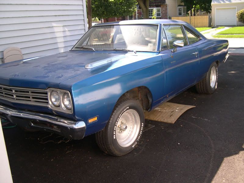Car is a 1969 Roadrunner, Blue Fire Metallic, 4 speed, 440. The car needs to be finished. What I have done so far: Rebuilt 440, heads done, new Holley carb, all new everything except block, pistons, rods, and crank, new headers, etc, underhood paint, engine all correct, new Centerforce clutch, flywheel as well. Interior 1/2 gutted. What it needs: floorboards, interior, gas tank, exhaust, engine completed (wired up), clutch linkage, bodywork, paint. Also included with the car is a Master Power power disc brake conversion kit, new radiator, hei conversion, throttle linkage, new harnesses, electric fan setup, switches, and all sorts of other new parts. Really sad to see it go, but I have nowhere else to put it and finish it.