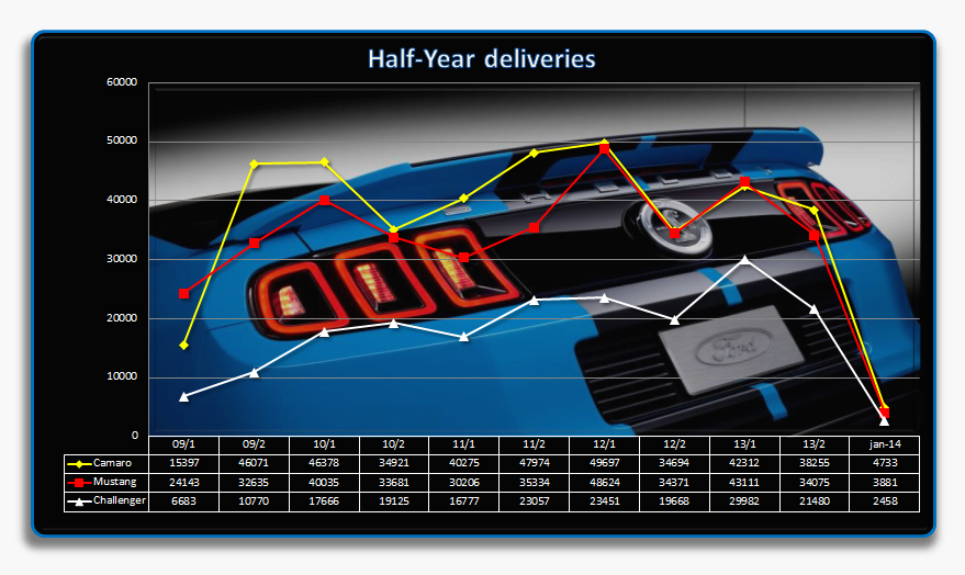 Camaro January 2014 Deliveries (actual sales): 4,733 -4% (Pr Ye) Compared to Competition: Mustang January 2014 Delivery (sales):3,881 8% (Pr Ye) Challenger January 2014 Delivery (sales):2,458 -30% (Pr Ye) Last edited by Enator; 02-03-2014 at 04:50 PM. |
