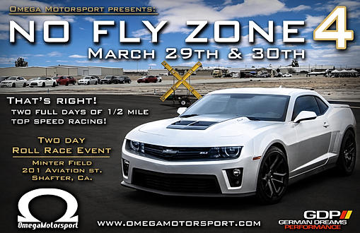 http://www.omegamotorsport.com/#!no-fly-zone-4/cf21 It's in Shafter, CA (aka 20 mins north of Bakersfield) "No Fly Zone 4" March 29/30th, 2014 Should be awesome like it was when I went for NFZ2 and NFZ3. You get a TON of runs in, because they stage cars about every 30 seconds. Hoping to see some Camaros out there, it's always fun to race with you guys. There is a 100 car limit, so sign up soon. ($200 per day) Oh and here is a video from No Fly Zone 2 back in early 2013, back when I was stock (just an intake) vs a GT500